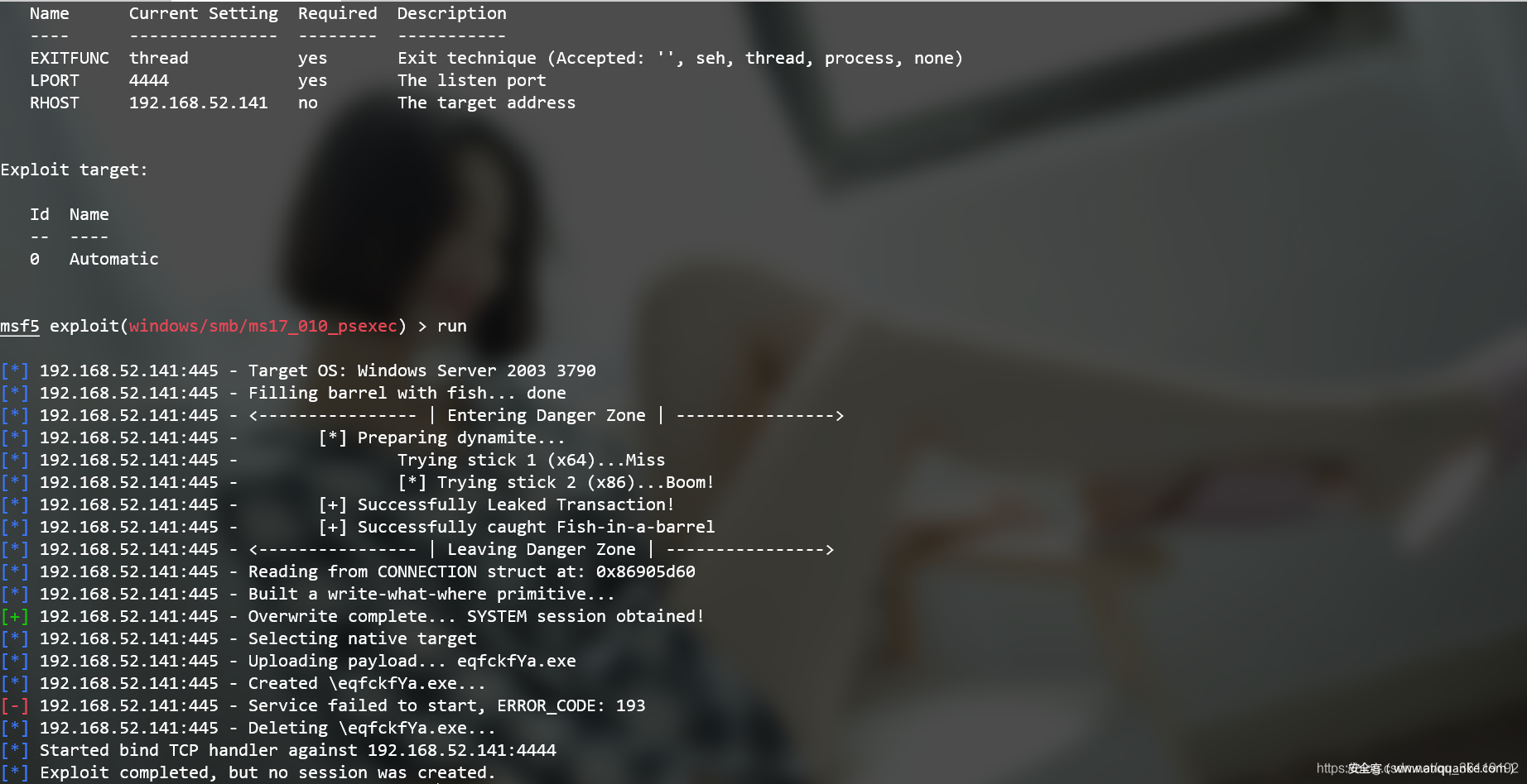 永恒之蓝在内网渗透中是屡试不爽的,基本上一打一大片。但是MS17-010在实际红蓝对抗渗透中(通过代理打内网)并不好利用,MSF中自带的模块要打很多次才能成功一次,而且MSF自带的模块打sever2003的机器很容器蓝屏。注意这里的payload必须设置为正向连接 bind_tcp。