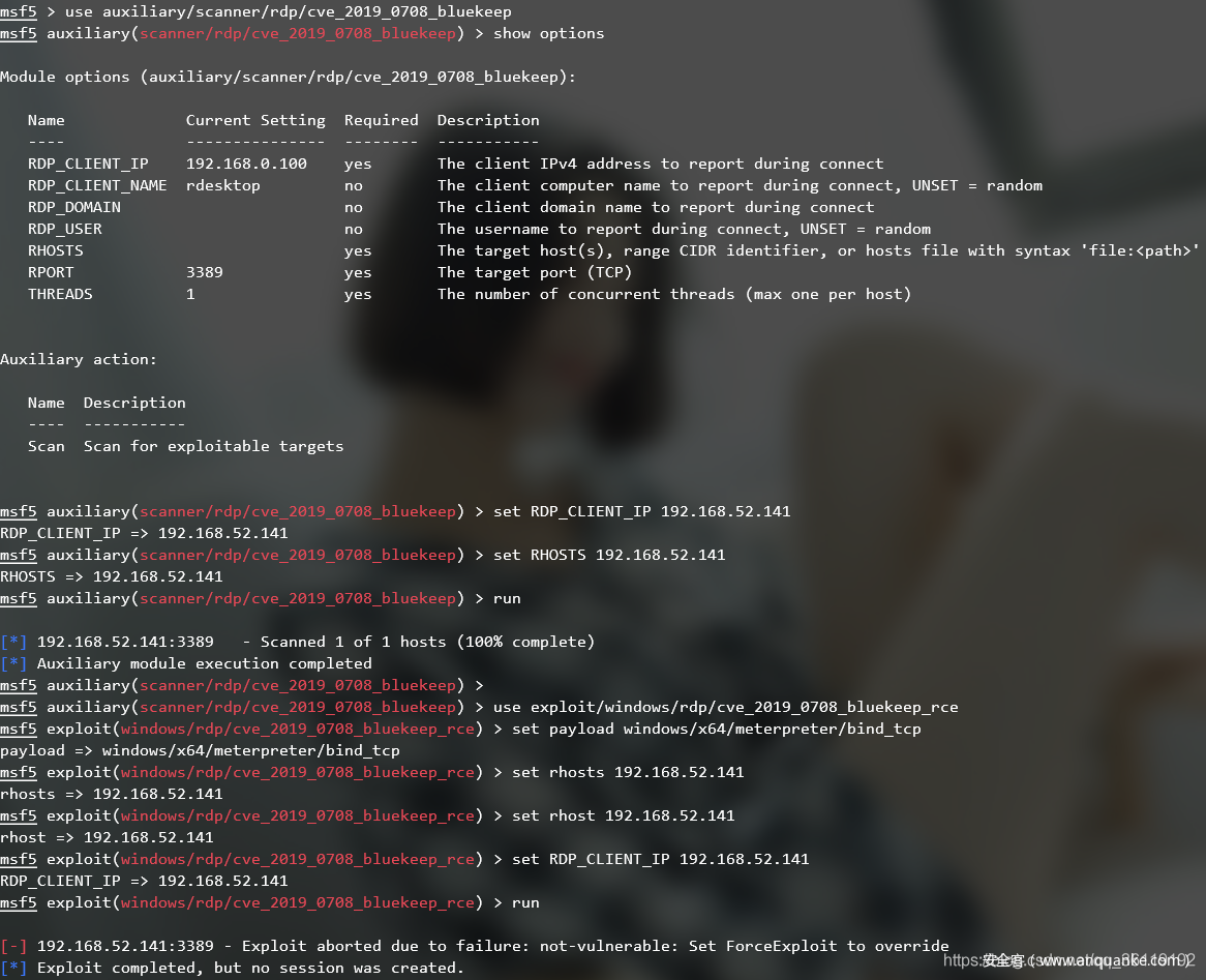 该漏洞是今年爆出的一个windows RDP协议的漏洞,但是测了一下,发现该主机不存在该漏洞。另外,该漏洞成功率也不高,而且极有可能把目标机打成蓝屏的结果。所以在真实红蓝对抗中不建议使用该漏洞,除非有百分百的把握能打成功。