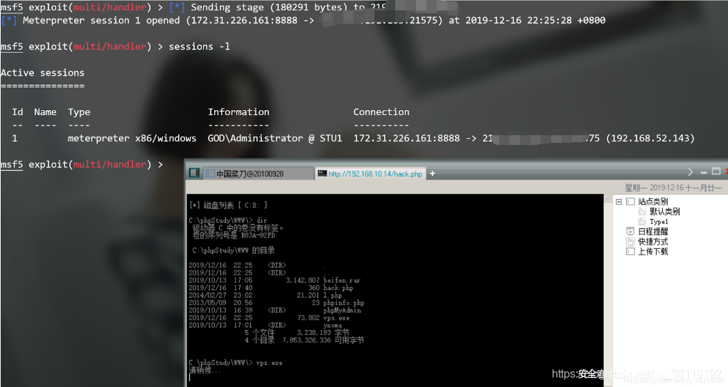 现在我们想反弹一个MSF的shell。将MSF生成的木马上传到该主机上,执行,反弹成功!
