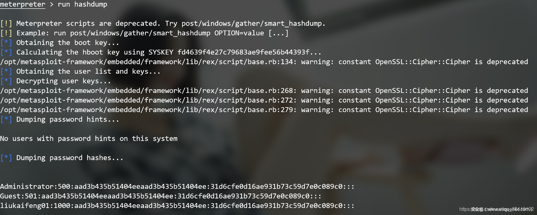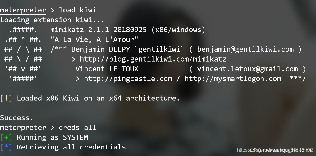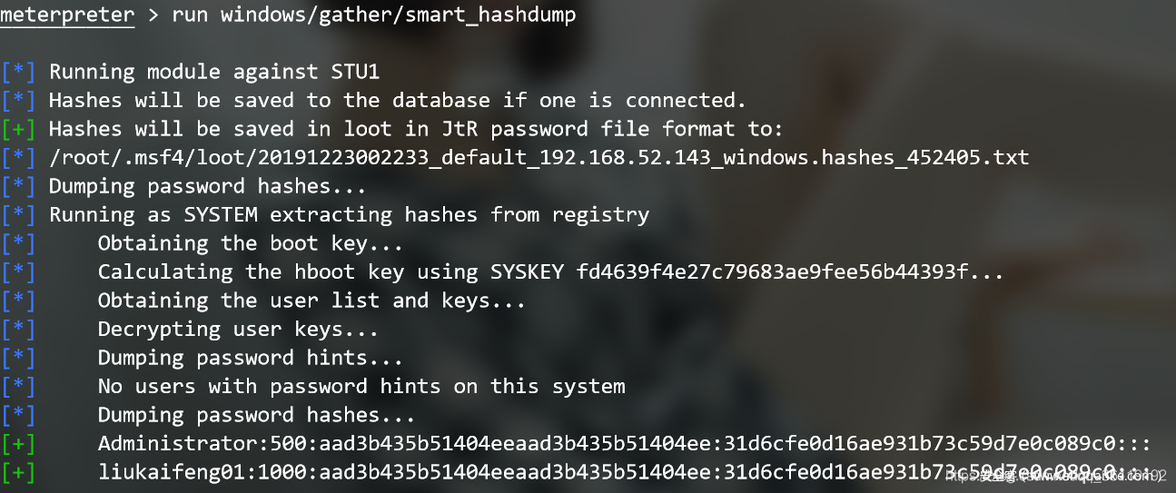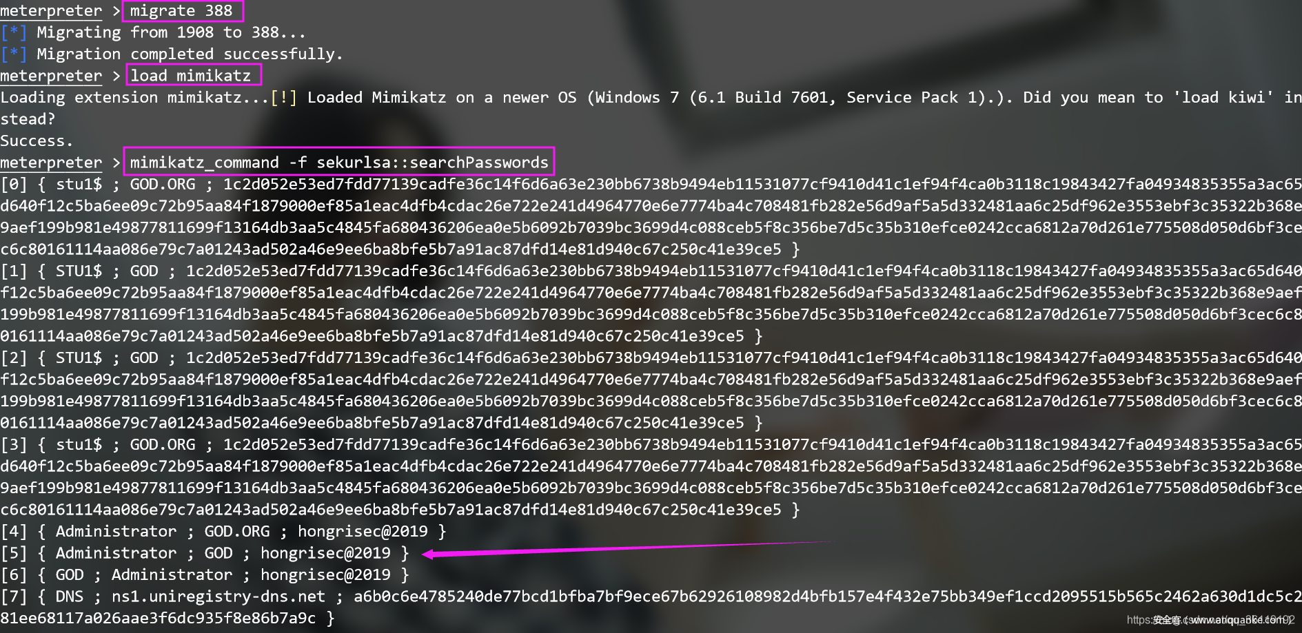 再尝试加载 mimikatz 模块,加载模块前需要先将meterpreter迁移到64位的进程,而且该进程也需要是system权限运行的。如图,成功获得账号密码:administrator/hongrisec@2019