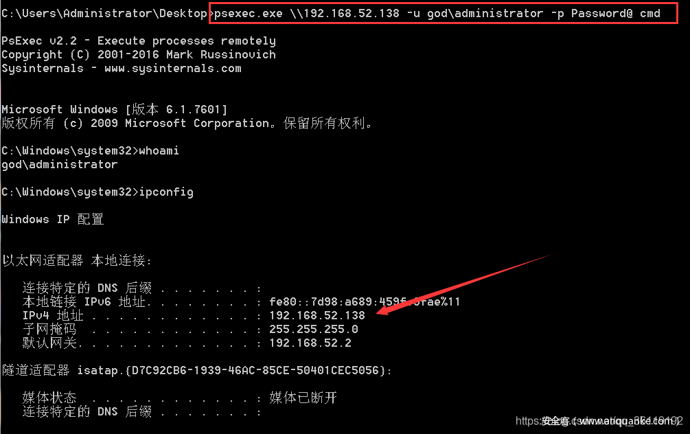 psexec.exe \\192.168.52.138 -u god\administrator -p Password@ cmd