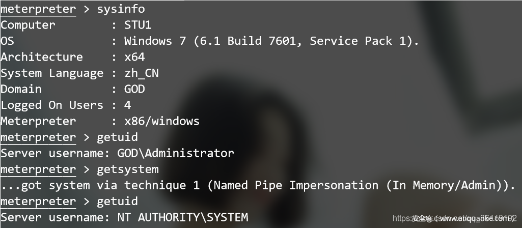 这里由于获得的直接是adminsitrator权限,所以可以直接提到system。在真实环境中,这里很多时候都是一个普通用户权限,需要我们去提权。