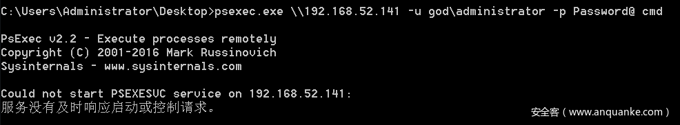 我们已经获得了域管理员 god/administrator 的账号密码,我们现在可以使用该域管理员账号密码利用 psexec 登录域内任何一台开启了admin$共享(该共享默认开启) 的主机。