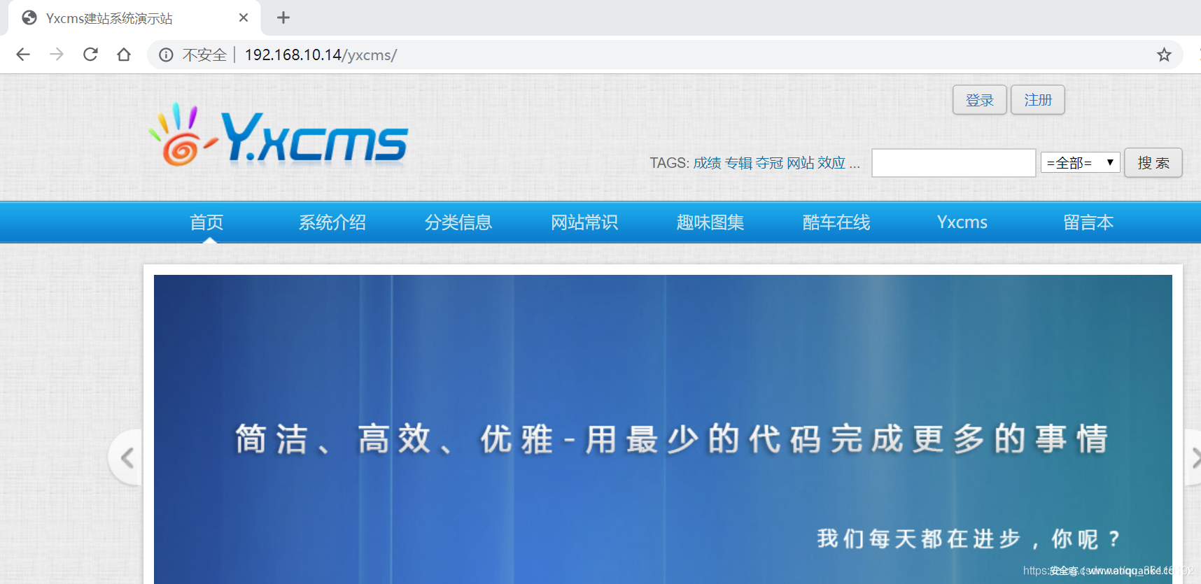 访问Web服务器地址 http://192.168.10.14/yxcms/ ,是一个yxcms的站点。关于yxcms的漏洞,传送门:代码审计| yxcms app 1.4.6 漏洞集合