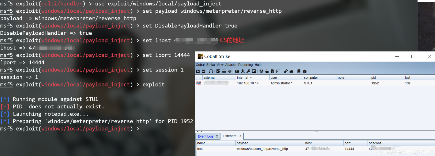 然后在MSF中执行以下操作,我们的CobaltStrike就接收到反弹过来的shell了。