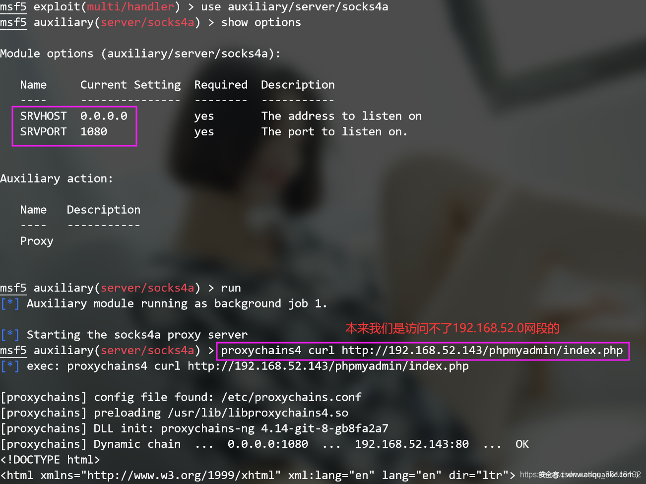 这里我实测用MSF挂的socks4a代理并不稳定,建议实战环境用 FRP 起的 socks5 代理,这里我为了省事直接用MSF的socks代理。其实新版的MSF也有了socks5代理,不过好像也不是很好用。