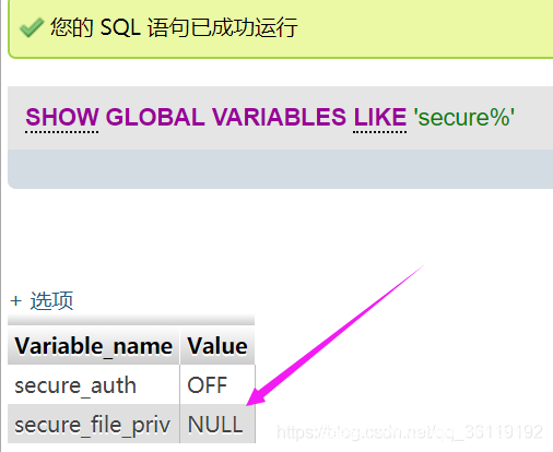 这里由于 secure_file_priv的值为NULL,所以我们不能利用写into outfile写木马getshell。