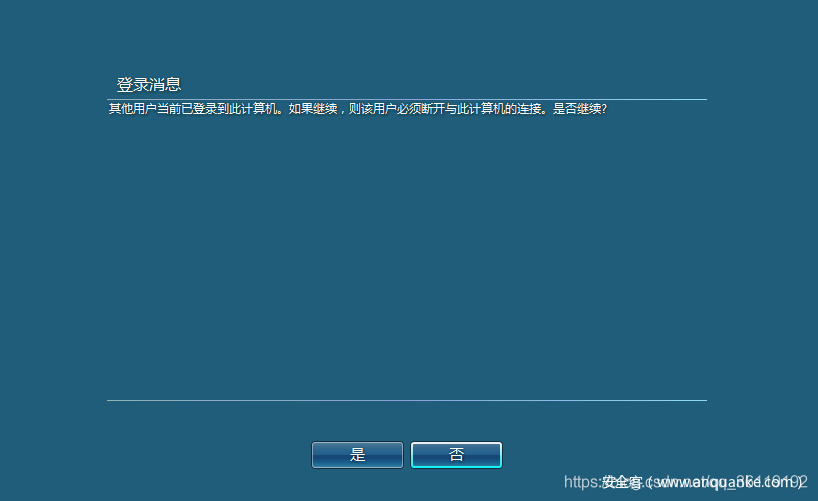 尝试3389远程登录该主机,但是弹出如果我们继续登录,则会断开该主机的当前连接。为了不惊动管理员,这里我们不继续连接了。