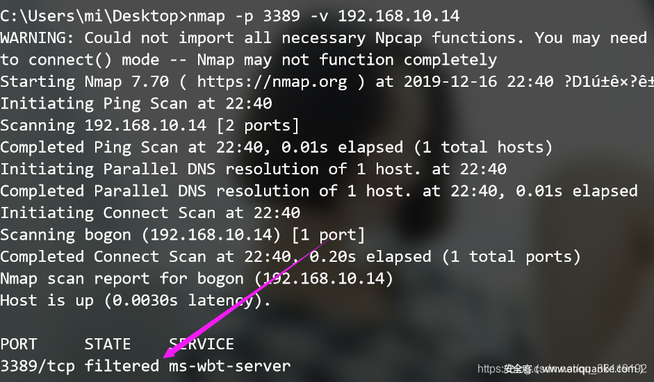 通过nmap扫描发现该主机的3389端口呈过滤状态,由此猜想可能是防火墙将该端口过滤了