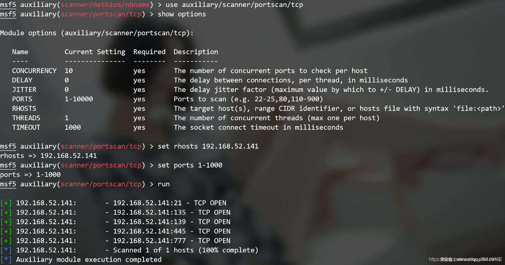 auxiliary/scanner/portscan/tcp #基于tcp进行端口扫描(默认扫描1-10000)