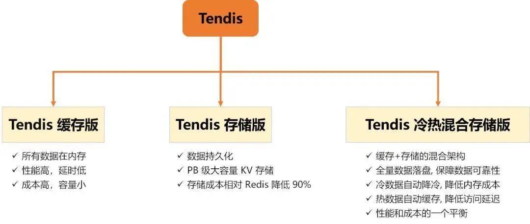 Tendis 是集腾讯众多海量 KV 存储优势于一身的 Redis 存储解决方案, 并 100% 兼容 Redis 协议和 Redis4.0 所有数据模型。作为一个高可用、高性能的分布式 KV 存储数据库, 从访问时延、持久化需求、整体成本等不同维度的考量, Tendis 推出了 缓存版 、 混合存储版 和 存储版 三种不同产品形态,并将存储版开源。