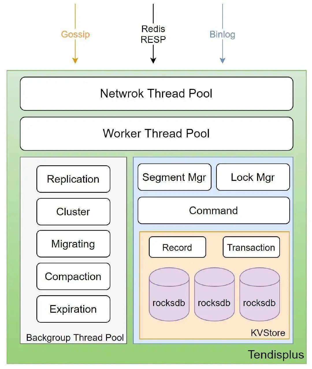Tendis 存储版适用于大容量, 延迟不敏感型业务, 数据全部存储在 磁盘, 适合温冷数据的存储。Tendis 存储版是腾讯互娱 CROS DBA 团队 & 腾讯云数据库团队 自主设计和研发的开源分布式高性能 KV 存储系统。另外在 可靠性、复制机制、并发控制、gossip 实现以及数据搬迁等做了大量的优化, 并且解决了一些 Redis cluster 比较棘手的问题。完全兼容 Redis 协议, 并使用 RocksDB 作为底层存储引擎。