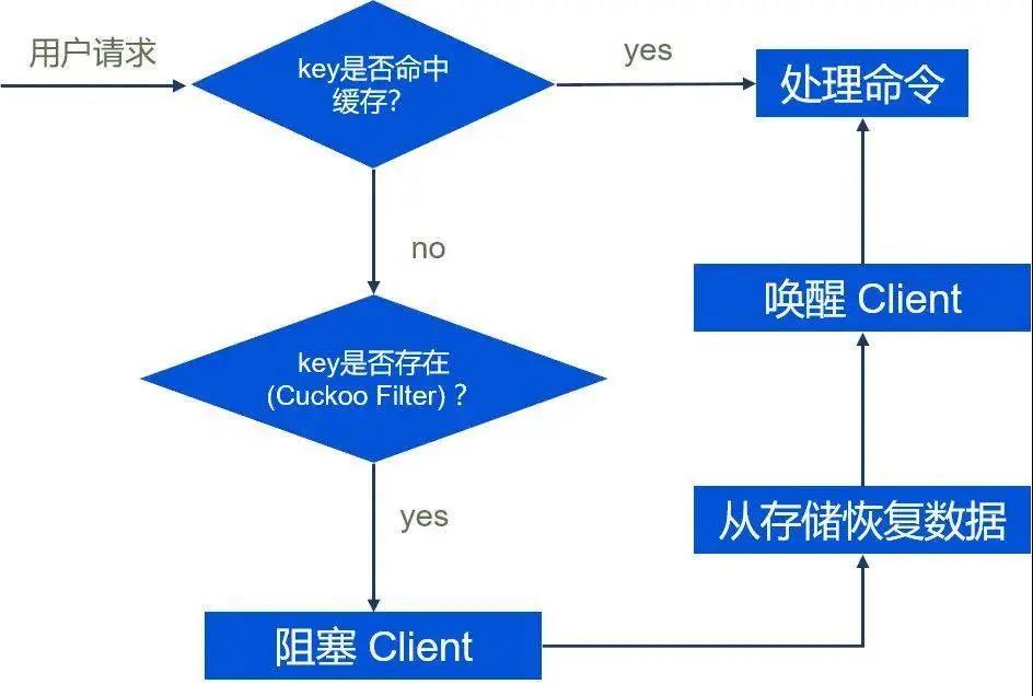 首先判断 Key 是否在缓存层, 如果缓存层存在, 则执行命令; 如果缓存层不存在, 查询 Cuckoo Filter, 判断 Key 是否有可能在存储层;