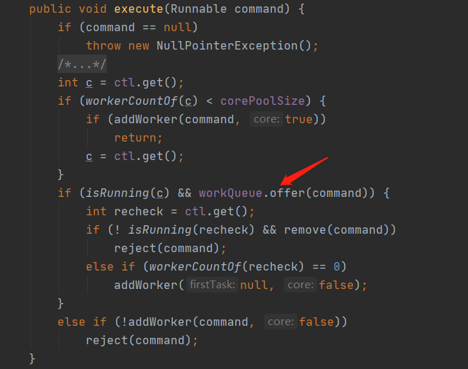 execute 方法想必大家都不陌生,就是给线程池提交任务的方法。在这个方法中可以看到只要在 offer 方法内部判断此时线程数还小于最大线程数的时候返回 false,即可走下面 else if 中 addWorker (新增线程)的逻辑,如果数量已经达到最大线程数,直接入队即可。