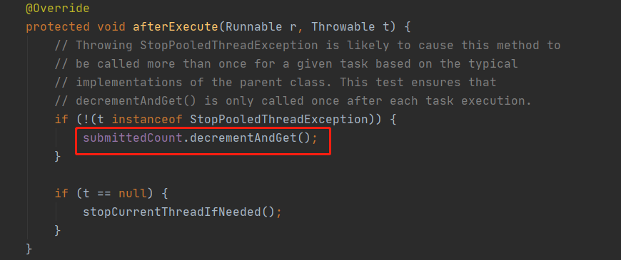 然后上面的代码其实只看到 submittedCount 的增加,正常的减少在 afterExecute 里实现了。