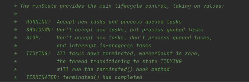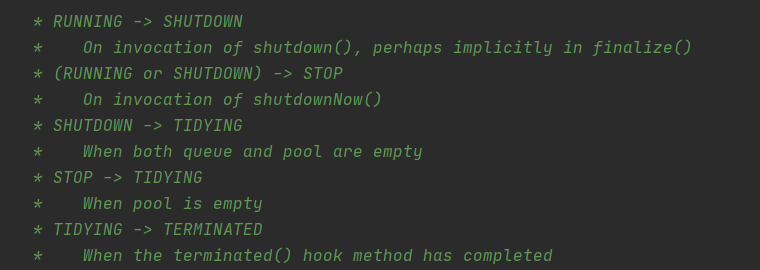 TIDYING:所有任务都终止,并且工作线程也为0,处于关闭之前的状态