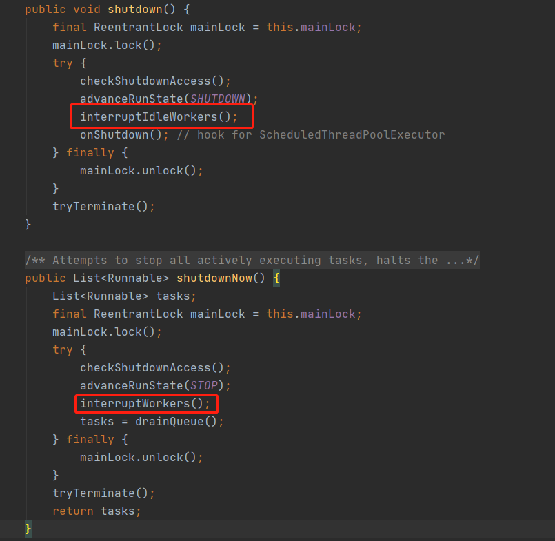 根据这两个方法,又可以扯到 shutdown 和 shutdownNow,就是关闭线程池的方法,一个是安全的关闭线程池,会等待任务都执行完毕,一个是粗暴的直接咔嚓了所有线程,管你在不在运行,两个方法分别调用的就是 interruptIdleWorkers() 和 interruptWorkers() 来中断线程。