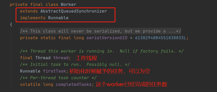 Worker 是属于工作线程的封装类,它不仅实现了 Runnable 接口,还继承了 AQS。