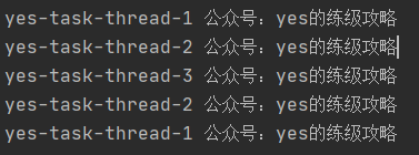 public static void main(String[] args) { YesThreadPool pool = new YesThreadPool(new LinkedBlockingQueue<>(10), 3); IntStream.rangeClosed(1, 5).forEach((i)-> { try { pool.execute(()-> { System.out.println(Thread.currentThread().getName() + " 公众号:yes的练级攻略"); }); } catch (InterruptedException e) { logger.error("记录点东西.....", e); } }); }