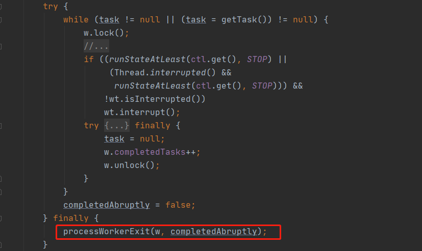 而这一层外面,还有个try finally,所以异常的抛出打破了 while 循环,最终会执行 `processWorkerExit方法