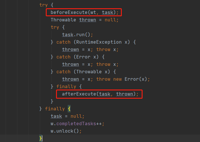 嘿嘿,细心的同学想必已经瞄到了上面的代码,task.run() 被 try catch finally包裹,异常被扔到了 afterExecute 中,并且也继续被抛了出来。