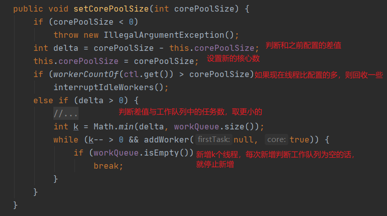 随着注释看下来应该没什么问题,就是那个 k 值我说一下,李老觉得核心线程数是配置了,但是此时线程池内部是否需要这么多线程是不确定的,那么就按工作队列里面的任务数来,直接按任务数立刻新增线程,当任务队列为空了之后就终止新增。