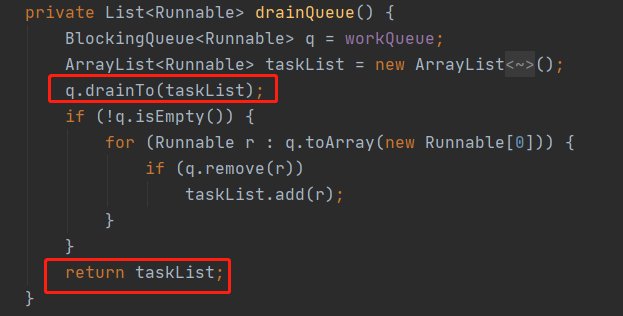 这里可能又会有同学有疑问,都 drainTo 了,为什么还要判断一下队列是否为空,然后进行循环?