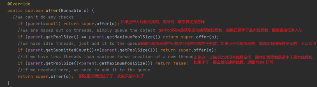 可以看到这个任务队列继承了 LinkedBlockingQueue,并且有个 ThreadPoolExecutor 类型的成员变量 parent ,我们再来看下 offer 方法的实现,这里就是修改原来线程池任务提交与线程创建逻辑的核心了。