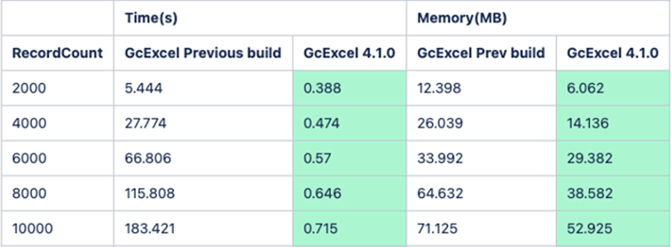 如下是GcExcel 的性能指标对比(相对上一个版本)