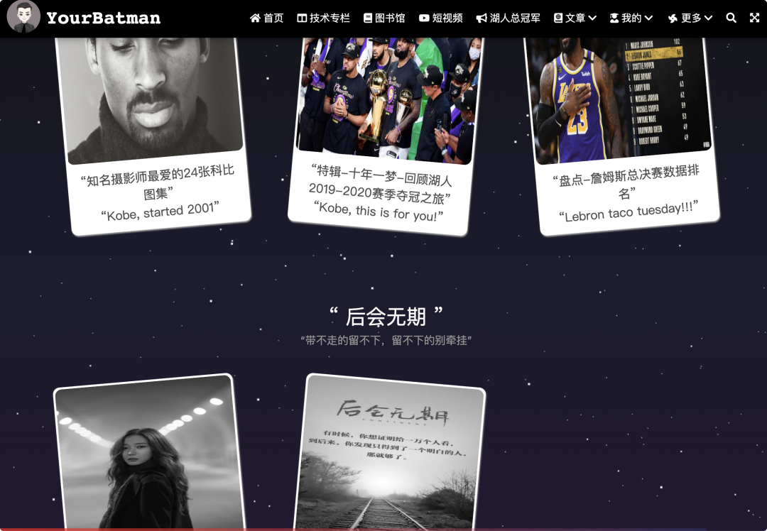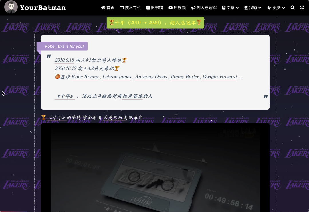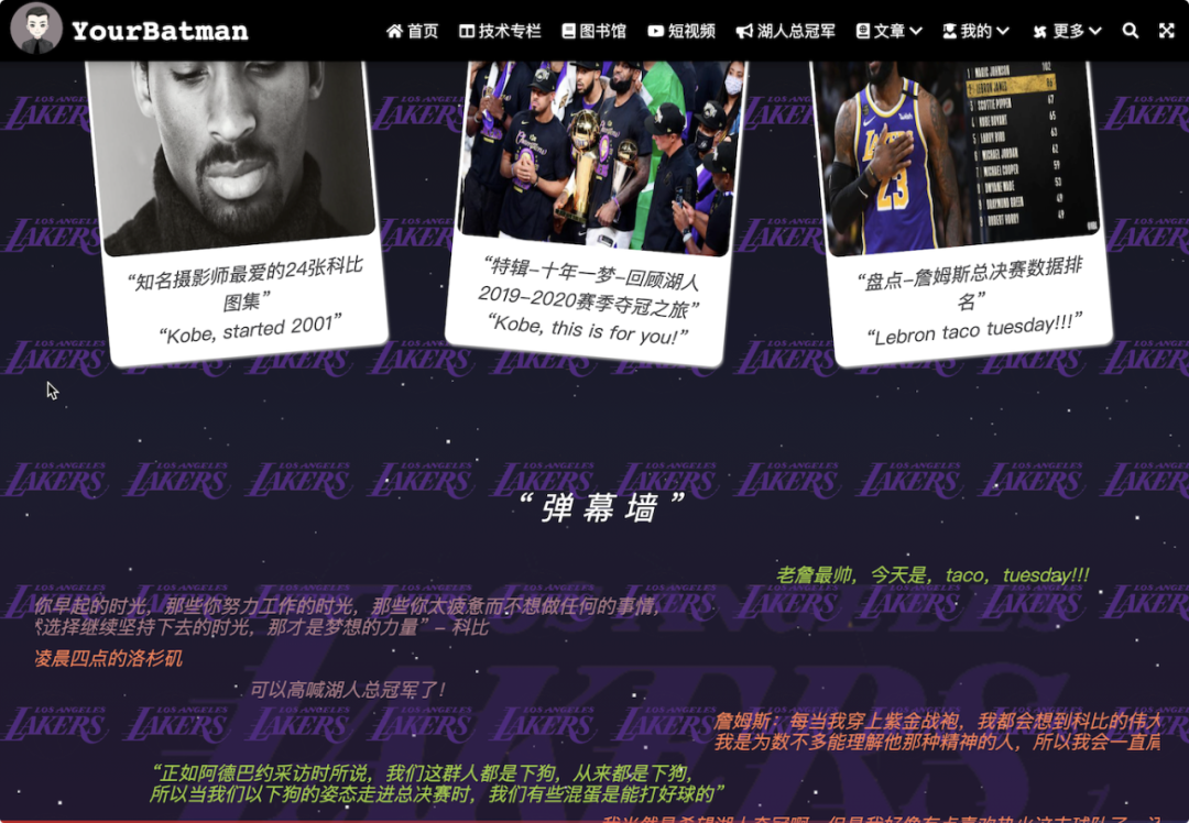 提供“湖人总冠军”、“小游戏”、“个人简历”等功能页面,能让站点多些人文气息。技术人并非一块木头~ -