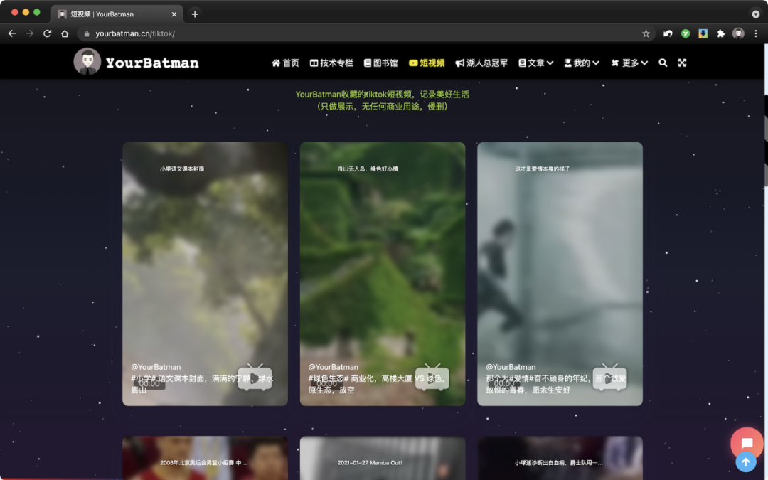 本页面用于搜藏”经典“短视频,内容主要来自自制和抖音。相同的搜集理念:聚焦。因此数量不会很多,但尽力确保每个都值得留念,如下图所示: