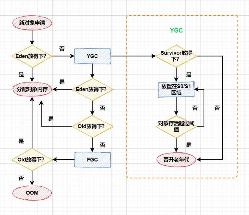 Eden放的下,则直接存入Eden;如果存不下则进行YGC; YGC之后如果能存下则放入Eden,如果还存不下(为超大对象),则尝试存入Old区;- 如果