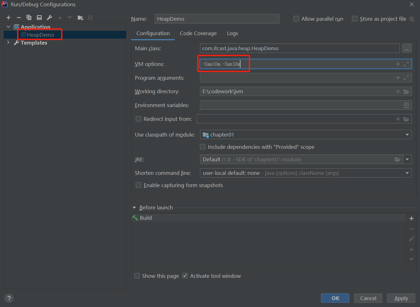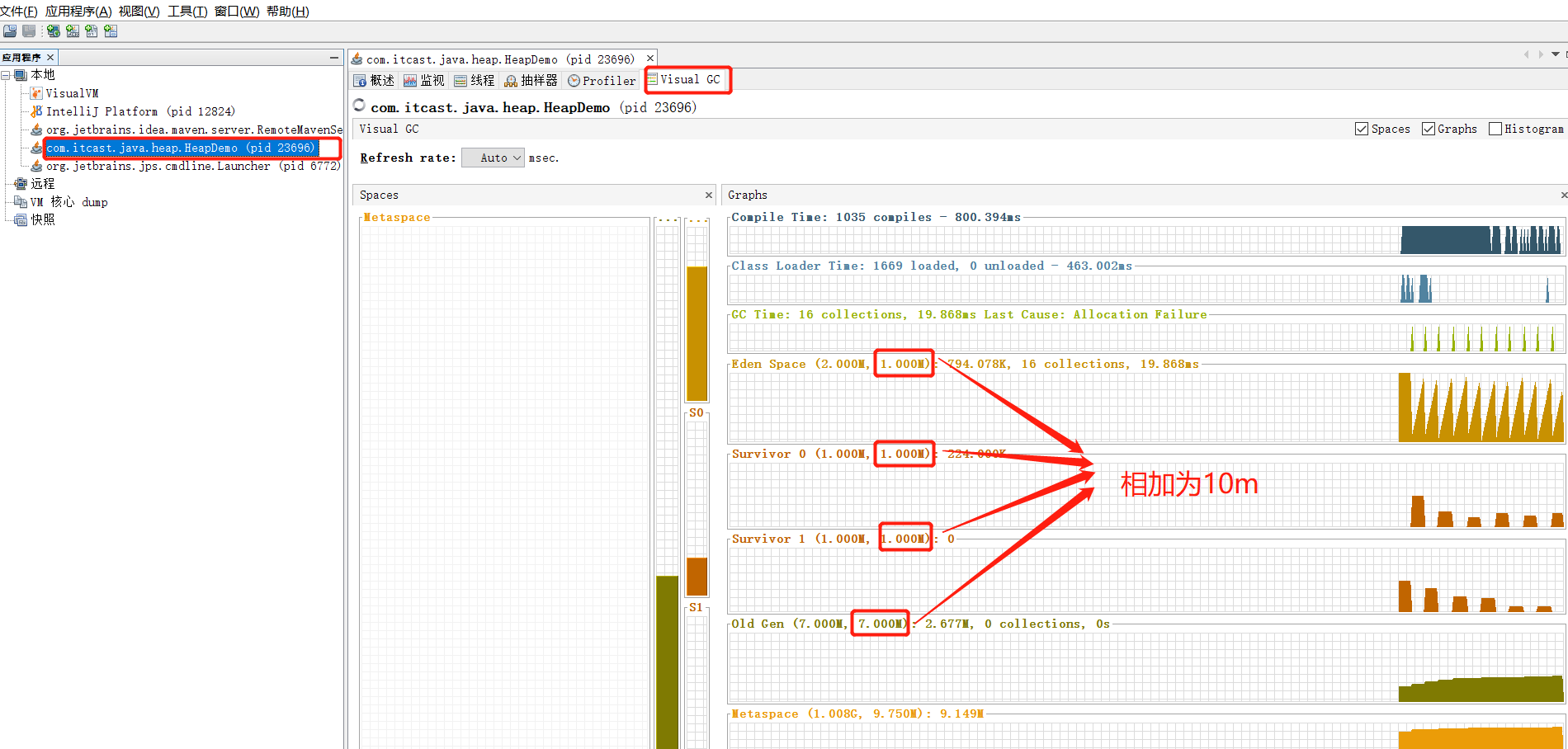 -Xms10m用于表示堆区的起始内存为10m,等价于-XX:InitialHeapSize;-Xmx10m用于表示堆区的最大内存为10m,等价于-XX:MaxHeapSize;- 其中