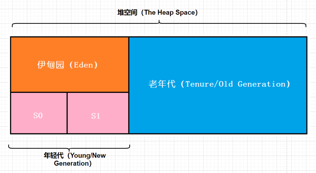 如图所示,堆区又分为年轻代(YoungGen)和老年代(OldGen);其中年轻代又分为伊甸园区(Eden)和幸存者区(Survivor);幸存者区分为幸存者0区(Survivor0,S0)和幸存者1区(Survivor1,S1),有时也叫from区和to区。