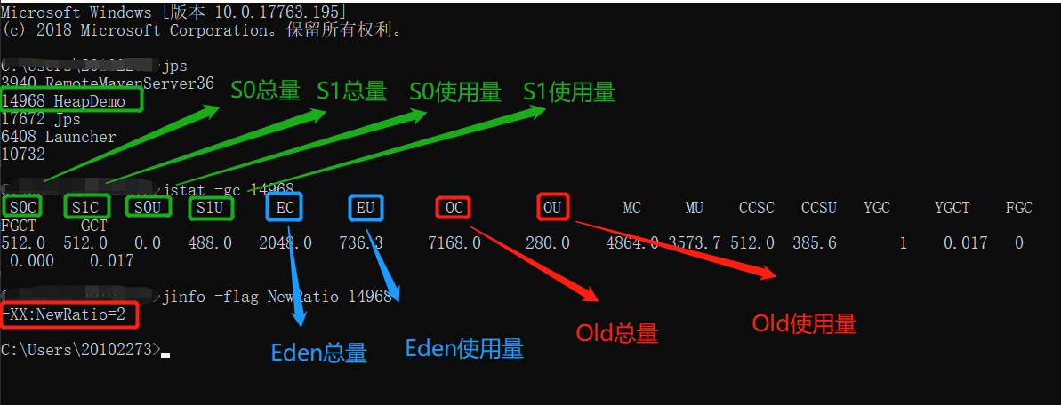 以上边的代码为例:设置启动参数-XX:+PrintGCDetails;可在cmd窗口中输入jps查询进程号,然后通过jstat -gc 进程id指令查看进程的内存使用情况。