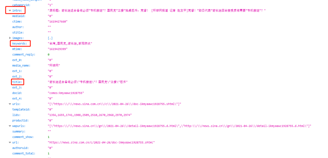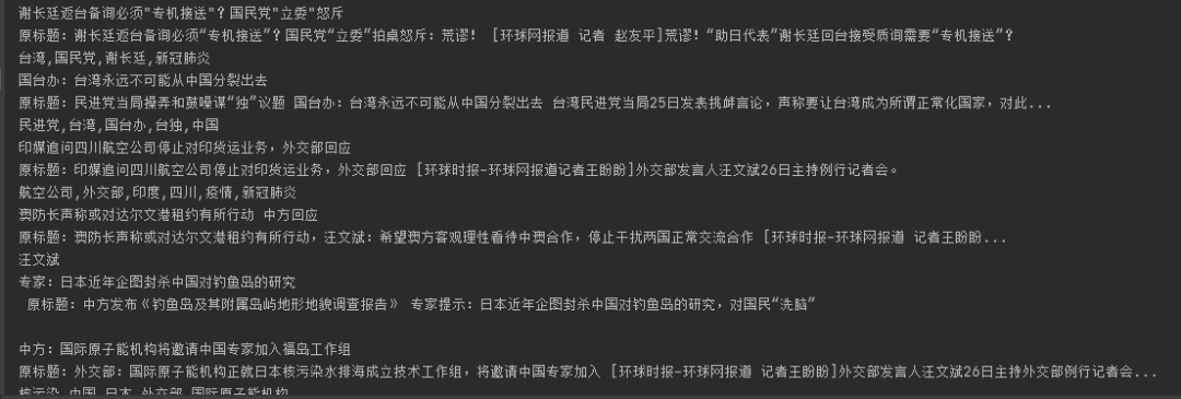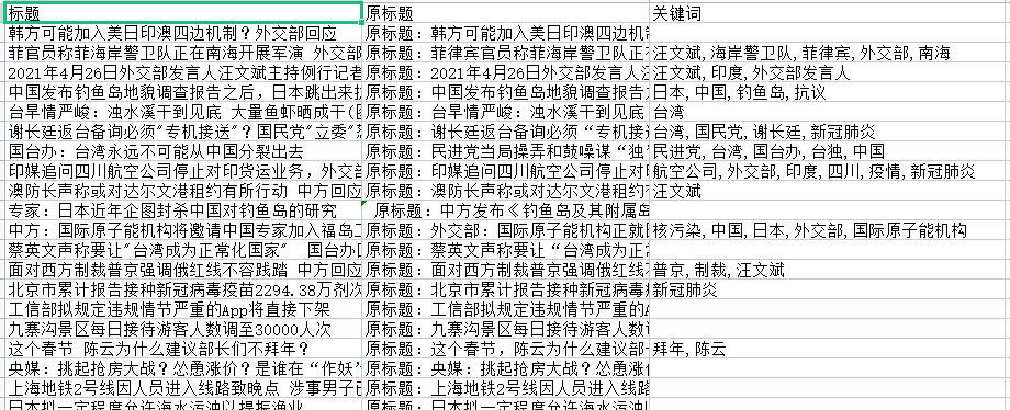 今天教大家如何爬取新浪网新闻数据,通过词云可视化展示新闻关键词,快速了解最新的新闻热点。这里爬取了**2500**条新闻数据进行演示。  PS:这里采集的主要是国内最新新闻数据。先来看一下数据:  # 1、网页分析 在开始采集之前先说一下新闻数据来源(新浪网) ``` https://news.sina.com.cn/china/ ```  ### 下一页分析 我们想要采集多条数据,因此需要找到下一页的规律  点击第二页的时候,发现网页链接没有变化,这里数据是通过异步加载过来,因此查看network,找到了目标异步链接: ``` https://feed.sina.com.cn/api/roll/get?pageid=121&lid=1356&num=20&versionNumber=1.2.4&page=2&encode=utf-8&callback=feedCardJsonpCallback&_=1619440444354 ``` 但发现callback=feedCardJsonpCallback&_=1619440444354,可以去掉,因此最终链接如下: ``` https://feed.sina.com.cn/api/roll/get?pageid=121&lid=1356&num=20&versionNumber=1.2.4&page=2&encode=utf-8 ``` 参数page是页数,经过测试page范围在1~125,到126的时候就请求到的是空数据。每一页一共有20条,因此一共是**2500**条新闻数据。 ### json数据结构   这里咱们学院获取三个字段(标题title、原标题intro、关键词keywords) # 2、采集数据 今天教大家如何爬取新浪网新闻数据,通过词云可视化展示新闻关键词,快速了解最新的新闻热点。这里爬取了**2500**条新闻数据进行演示。  PS:这里采集的主要是国内最新新闻数据。先来看一下数据:  # 1、网页分析 在开始采集之前先说一下新闻数据来源(新浪网) ``` https://news.sina.com.cn/china/ ```  ### 下一页分析 我们想要采集多条数据,因此需要找到下一页的规律  点击第二页的时候,发现网页链接没有变化,这里数据是通过异步加载过来,因此查看network,找到了目标异步链接: ``` https://feed.sina.com.cn/api/roll/get?pageid=121&lid=1356&num=20&versionNumber=1.2.4&page=2&encode=utf-8&callback=feedCardJsonpCallback&_=1619440444354 ``` 但发现callback=feedCardJsonpCallback&_=1619440444354,可以去掉,因此最终链接如下: ``` https://feed.sina.com.cn/api/roll/get?pageid=121&lid=1356&num=20&versionNumber=1.2.4&page=2&encode=utf-8 ``` 参数page是页数,经过测试page范围在1~125,到126的时候就请求到的是空数据。每一页一共有20条,因此一共是**2500**条新闻数据。 ### json数据结构   这里咱们学院获取三个字段(标题title、原标题intro、关键词keywords) # 2、采集数据 ### 采集第一页 分析好之后,下面开始使用python编程采集数据。 ``` url="https://feed.sina.com.cn/api/roll/get?pageid=121&lid=1356&num=20&versionNumber=1.2.4&page=1&encode=utf-8" ```  这是第一页的数据,已经可以成功采集,只需要改变page值就可以采集下一页数据。接着开始把采集的数据存入到excel中。 ### 保存数据 这里使用openxl库去将数据保存到excel中,先定义表头 ``` outwb = openpyxl.Workbook() ``` 接着写入到excel中 ``` count = 2 ```   # 3、词云可视化 这里主要绘制三个词云可视化(用标题、原标题、关键词分布作为数据去画图)。 标题是原标题的精简版,关键词是这篇文章的核心关键词,通过绘制这个三个词云图,然后进行对比分析。 读取数据 ``` datafile = u'新闻数据-李运辰.xls' ``` ### 标题词云可视化 ``` ###标题词云图 ```  ### 原标题词云可视化 在画词云图之前,先对数据进行处理一下(比如“原标题:”去掉)  ``` ###原标题词云图 ```  ### 关键词词云可视化 ``` ###关键词词云图 ```  **分析:** 三个词云图的时事热点都差不多,核心点在于“新冠肺炎”、“病例”、“北京”,“与外交国家等情况”。具体就不过多的说,通过词云图可以一目了然的了解到当前国内的核心热点关键词。 # 4、小结 为了大家方便学习,辰哥把本文的**完整源码**上传,需要的通过同名公众回复:**新闻** 本文讲解了如何去采集新浪网新闻数据并绘制词云图展示分析。 ### 采集第一页 分析好之后,下面开始使用python编程采集数据。 ``` url="https://feed.sina.com.cn/api/roll/get?pageid=121&lid=1356&num=20&versionNumber=1.2.4&page=1&encode=utf-8" ```  这是第一页的数据,已经可以成功采集,只需要改变page值就可以采集下一页数据。接着开始把采集的数据存入到excel中。 ### 保存数据 这里使用openxl库去将数据保存到excel中,先定义表头 ``` outwb = openpyxl.Workbook() ``` 接着写入到excel中 ``` count = 2 ```   # 3、词云可视化 这里主要绘制三个词云可视化(用标题、原标题、关键词分布作为数据去画图)。 标题是原标题的精简版,关键词是这篇文章的核心关键词,通过绘制这个三个词云图,然后进行对比分析。 读取数据 ``` datafile = u'新闻数据-李运辰.xls' ``` ### 标题词云可视化 ``` ###标题词云图 ```  ### 原标题词云可视化 在画词云图之前,先对数据进行处理一下(比如“原标题:”去掉)  ``` ###原标题词云图 ```  ### 关键词词云可视化 ``` ###关键词词云图 ```  **分析:** 三个词云图的时事热点都差不多,核心点在于“新冠肺炎”、“病例”、“北京”,“与外交国家等情况”。具体就不过多的说,通过词云图可以一目了然的了解到当前国内的核心热点关键词。 # 4、小结 为了大家方便学习,辰哥把本文的**完整源码**上传,需要的通过同名公众回复:**新闻** 本文讲解了如何去采集新浪网新闻数据并绘制词云图展示分析。