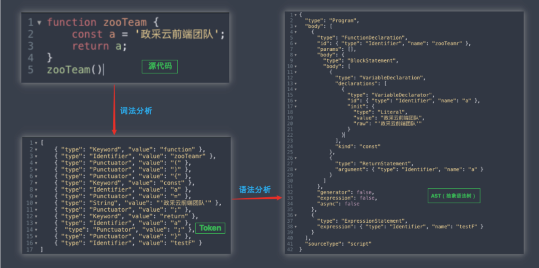 将 JS 代码拆分成对应的 Token,Token 是能拆分的最小单位,固定 type 表述类型/属性,value 表示对应的值,如下图 Token。