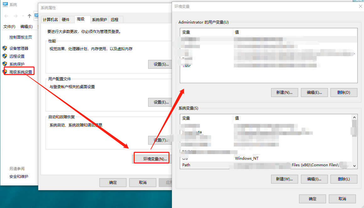 右键“我的电脑”-> 属性 -> 高级系统设置 -> 高级 -> 系统变量: