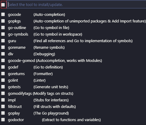 并选中Go:Install/Update Tools回车,并全部勾选,确认: