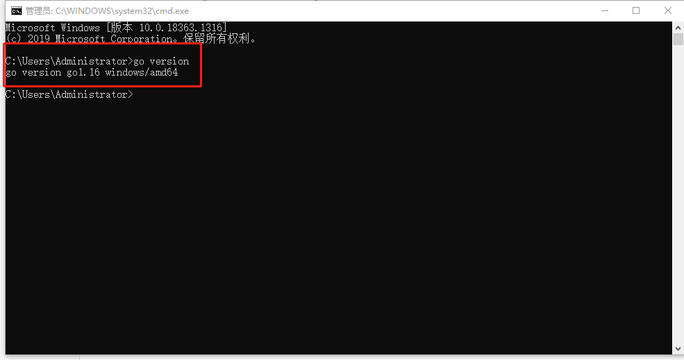 打开 cmd 命令行,执行 go version,检查是否安装成功并生效。