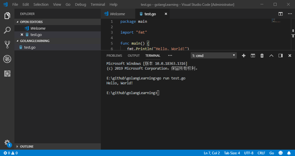 VSCode 中“Terminal” -> New Terminal,执行 go run test.go 命令直接运行 test.go 程序,结果如下: