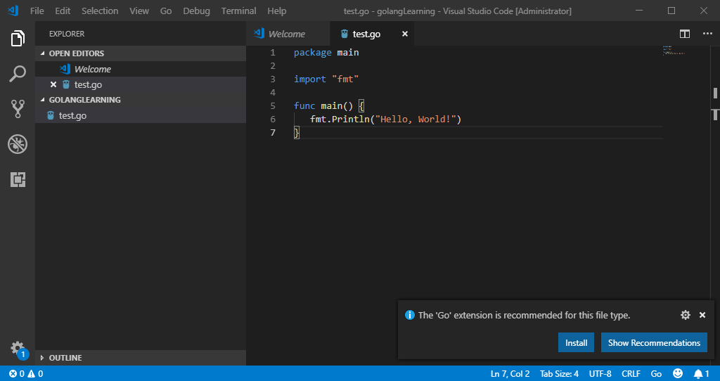(2)创建一个新的文件 test.go,编写 Hello, World! Go 程序,代码如下: