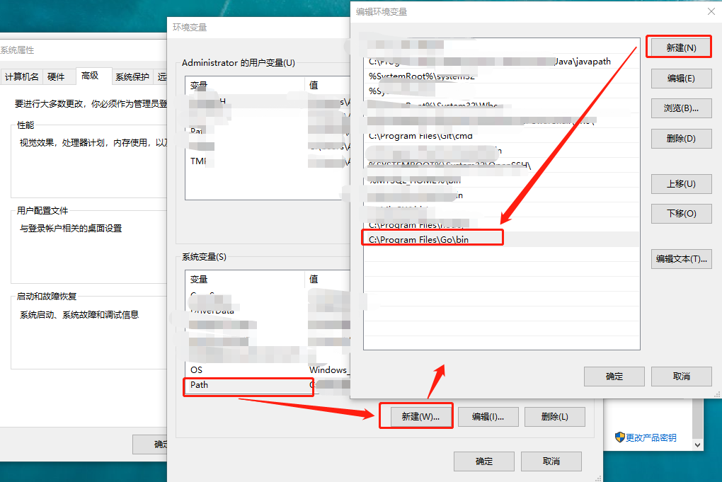 | Path | 添加Go开发包的 /bin 目录,如:C:\Program Files\Go\bin |