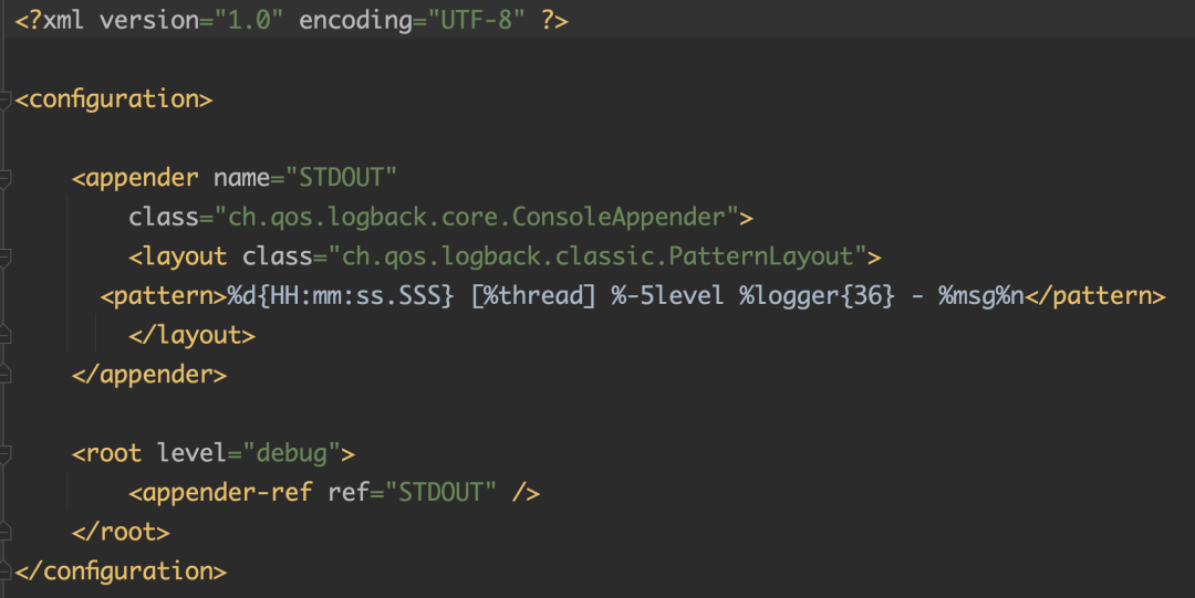 上面是一个基本的 logback 配置,里面列出了 logback 运行需要的关键组件。