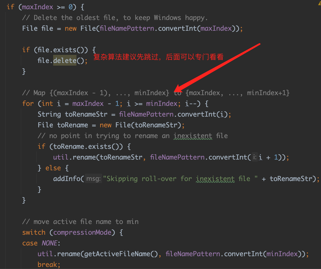 上面是 logback 日志文件分割的算法,在理解业务流程时,不建议马上去理解算法,可以放在后面自己另外定个目标理解。