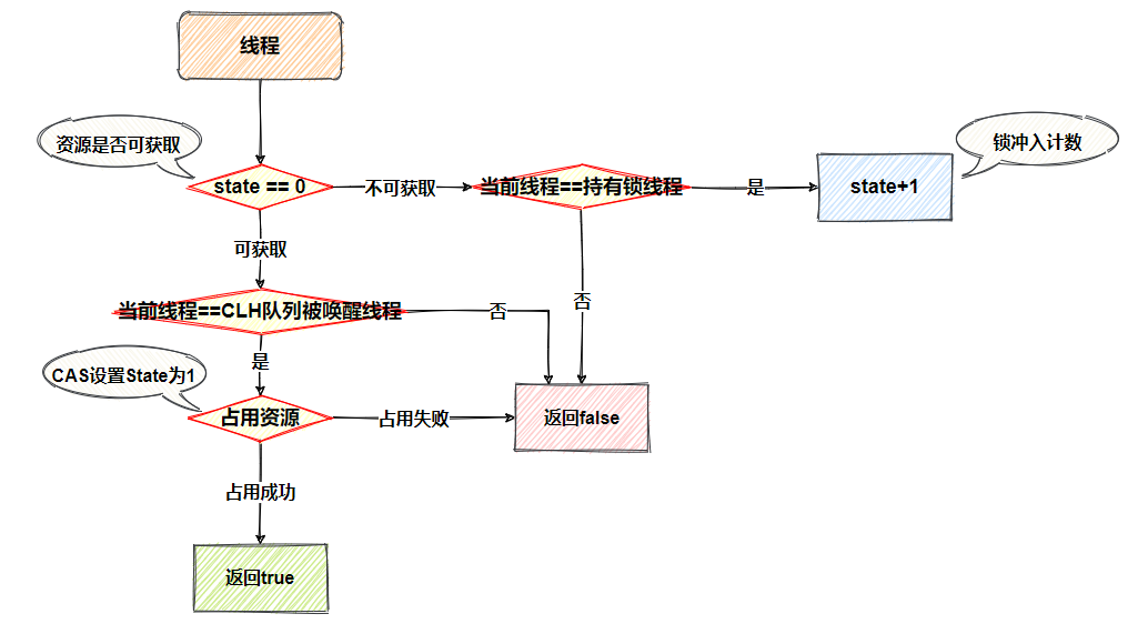 C A S设置state为1,C A S成功代表获取资源成功,否则获取资源失败 - 不可获取,判断当线程是不是持有锁的线程,如果是,