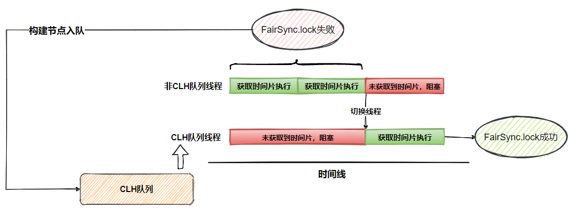 所谓公平策略就是,严格按照CLH队列顺序获取锁,线程释放锁时,会唤醒CLH队列阻塞的线程,重新竞争锁,要注意,此时可能还有非CLH队列的线程参与竞争,为了保证公平,一定会让CLH队列线程竞争成功,如果非CLH队列线程一直占用时间片,那就一直失败(构建成节点插入到CLH队尾,由A S Q模板流程执行),直到时间片轮到CLH队列线程为止,所以公平策略的性能会更差。