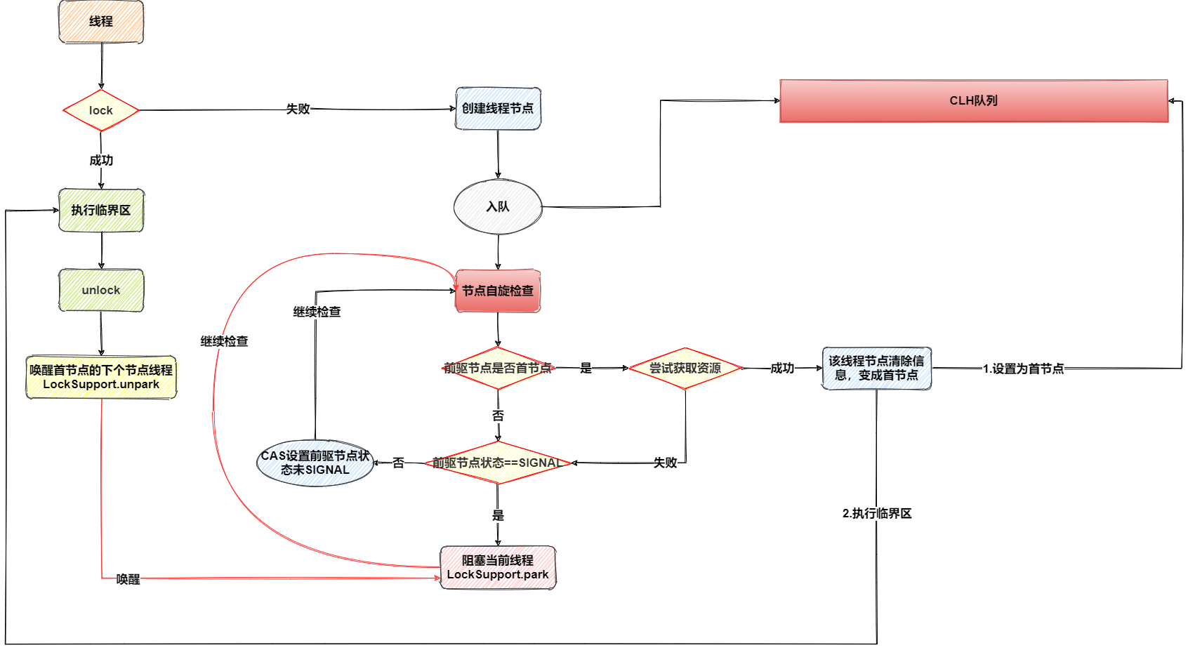 上图中,线程释放锁时,会唤醒CLH队列阻塞的线程,重新竞争锁,要注意,此时可能还有非CLH队列的线程参与竞争,所以非公平就体现在这里,非CLH队列线程与CLH队列线程竞争,各凭本事,不会因为你是CLH队列的线程,排了很久的队,就把锁让给你。